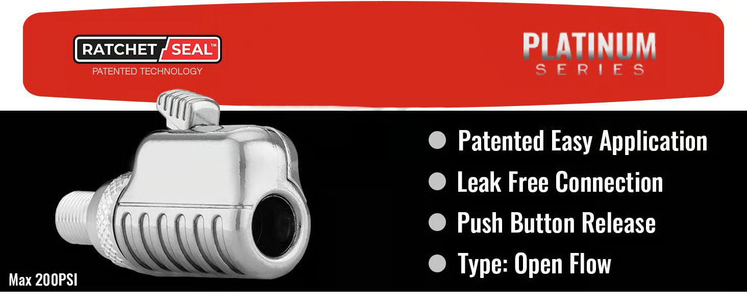 Upgrade your tire inflator with fast, frustration-free connectivity. The Platinum delivers a seamless push-to-connect experience using our patented RatchetSeal™ locking system, ensuring a secure, air-tight grip on any standard Schrader valve. Built for speed, durability, and professional performance—this is the tire chuck that transforms the way you inflate.